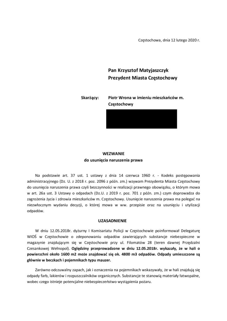 Na podstawie art. 37 ust. 1 ustawy z dnia 14 czerwca 1960 r. – Kodeks postępowania administracyjnego (Dz. U. z 2018 r. poz. 2096 z późn. zm.) wzywam Prezydenta Miasta Częstochowy do usunięcia naruszenia prawa czyli bezczynności w realizacji prawnego obowiązku, o którym mowa w art. 26a ust. 3 Ustawy o odpadach (Dz.U. z 2019 r. poz. 701 z późn. zm.) czym doprowadza do zagrożenia życia i zdrowia mieszkańców m. Częstochowy. Usunięcie naruszenia prawa ma polegać na niezwłocznym wydaniu decyzji, o której mowa w ww. przepisie oraz na usunięciu i utylizacji odpadów.