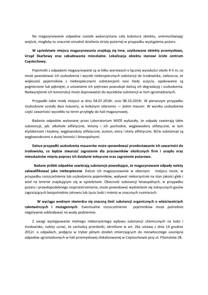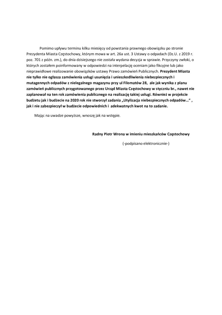 Pomimo upływu terminu kilku miesięcy od powstania prawnego obowiązku po stronie Prezydenta Miasta Częstochowy, którym mowa w art. 26a ust. 3 Ustawy o odpadach (Dz.U. z 2019 r. poz. 701 z późn. zm.), do dnia dzisiejszego nie została wydana decyzja w sprawie. Przyczyny zwłoki, o których zostałem poinformowany w odpowiedzi na interpelację oceniam jako fikcyjne lub jako nieprawidłowe realizowanie obowiązków ustawy Prawo zamówień Publicznych. Prezydent Miasta nie tylko nie ogłasza zamówienia usługi usunięcia i unieszkodliwienia niebezpiecznych i mutagennych odpadów z nielegalnego magazynu przy ul Filomatów 28, ale jak wynika z planu zamówień publicznych przygotowanego przez Urząd Miasta Częstochowy w styczniu br., nawet nie zaplanował na ten rok zamówienia publicznego na realizację takiej usługi. Również w projekcie budżetu jak i budżecie na 2020 rok nie stworzył zadania „Utylizacja niebezpiecznych odpadów…” , jak i nie zabezpieczył w budżecie odpowiednich i adekwatnych kwot na to zadanie.