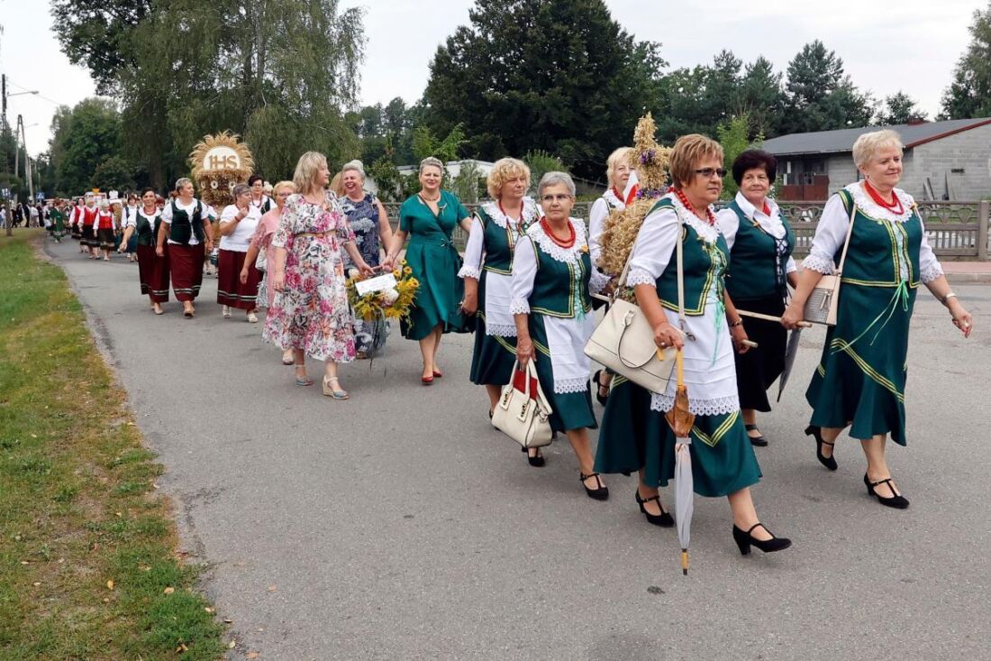 Gminne święto plonów rozpoczęło się barwnym korowodem z wieńcami prowadzonym przez Gminną Orkiestrę Dętą na czele ze sztandarami Jednostek Ochotniczych Straży Pożarnych i organizacji. Za nimi podążały panie z Kół Gospodyń Wiejskich niosąc przepiękne wieńce dożynkowe. Te symboliczne wieńce zostały przygotowane przez: KGW Brzeziny Nowe, KEiR z Huty Starej B, KGW Huta Stara B, KGW Bargły, KGW Nowa Wieś, Stowarzyszenie Wspólnie dla Rozwoju Sołectwa Zawodzie, KGW Huta Stara A, KGW Zawodzie, KGW Nierada, KGW Feniks ze Słowika, KEiR z Poczesnej, KGW Wrzosowa ze Stowarzyszeniem Razem dla Wrzosowej.