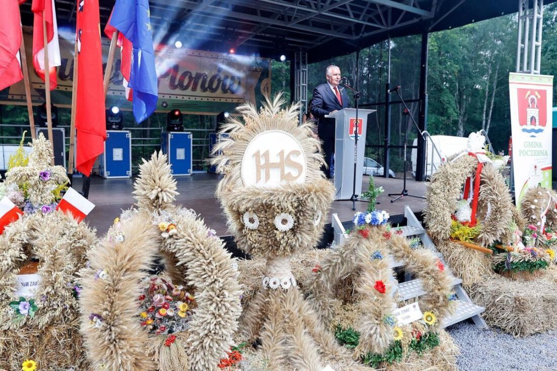 Po Mszy Świętej polowej, celebrowanej przez ks. prałata Jarosława Srokę, proboszcza parafii w Poczesnej, w imieniu wójta Krzysztofa Ujma, przewodniczącej Rady Gminy Iwona Choła oraz starostów gminnych Dożynek – Anny Rak i Janusza Matusiaka powitano przybyłych gości, wśród których byli także parlamentarzyści. Odczytano również nadesłane listy z życzeniami, w tym między innymi od: poseł do Parlamentu Europejskiego Jadwigi Wiśniewskiej; sekretarza stanu w Ministerstwie Kultury i Dziedzictwa Narodowego, posła Szymona Giżyńskiego; starosty zaprzyjaźnionej i partnerskiej Gminy Poczesna Gminy Jaszuny z Litwy Zdzisława Mażejko, prezes Agencji Restrukturyzacji i Modernizacji Rolnictwa Haliny Szymańskiej. Tradycyjnie wójt Krzysztof Ujma wraz ze starostami dożynek częstowali gości chlebem. A na zakończenie przybyłych mieszkańców bawił zespół “Zbóje”