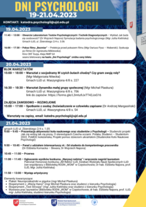 Wydarzenie organizowane jest po raz pierwszy i adresowane jest do studentów Uczelni. Udział w zaplanowanych warsztatach odbywa się po wcześniejszej rejestracji. Więcej informacji na stronie Uniwersytetu: https://www.ujd.edu.pl/news/view/dni-psychologii-zapraszamy-do-udziau-w-wydarzeniu