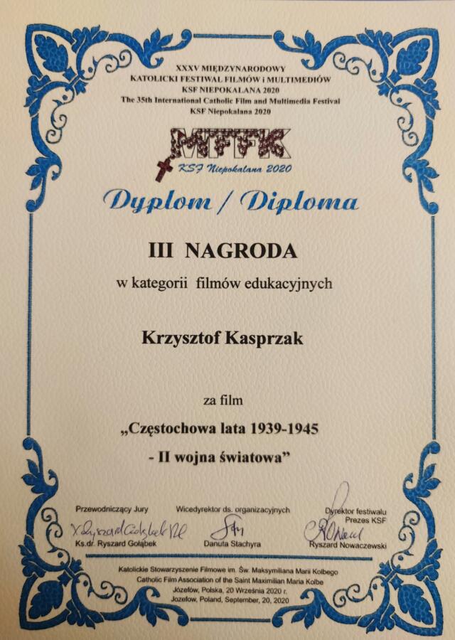 Jury XXXV Międzynarodowego Katolickiego Festiwalu Filmów i Multimediów „KSF Niepokalana 2020” przyznało III nagrodę w kategorii filmów edukacyjnych reżyserowi Krzysztofowi Kasprzakowi za film „Częstochowa lata 1939-1945 – II wojna światowa”.