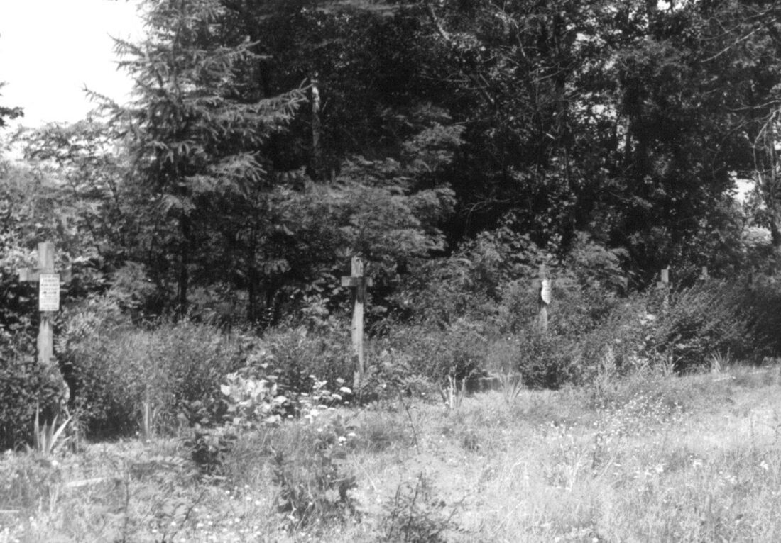- Archiwalne zdjęcie z końca lat 50. przedstawiające całkowicie zarośnięty fragment kwatery wojennej z 1939 roku, znajdującej się na cmentarzu w Złotym Potoku. Fot. ze zbiorów Adama Markowskiego