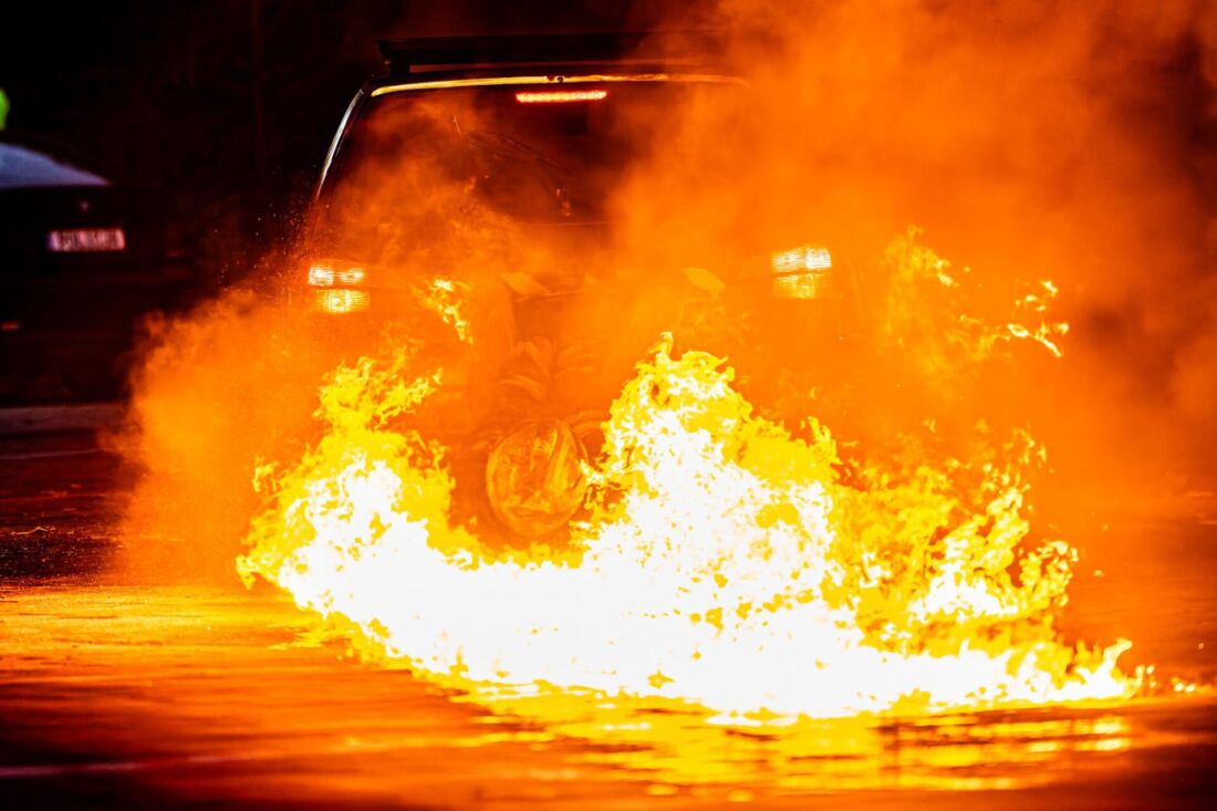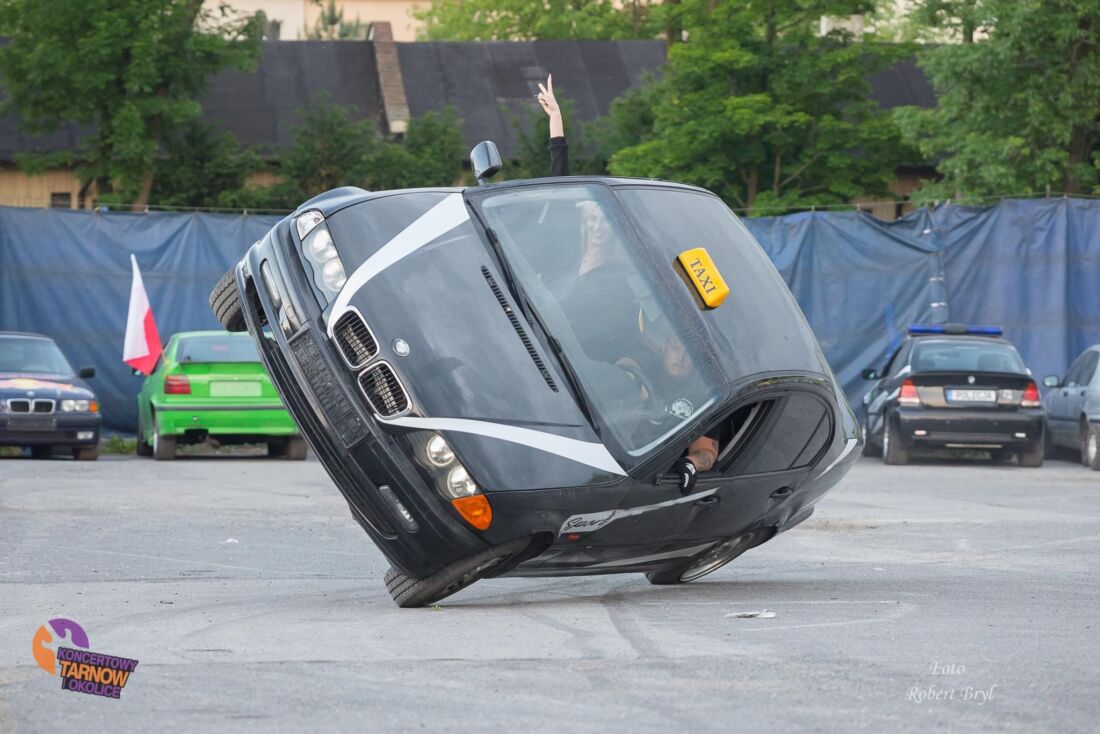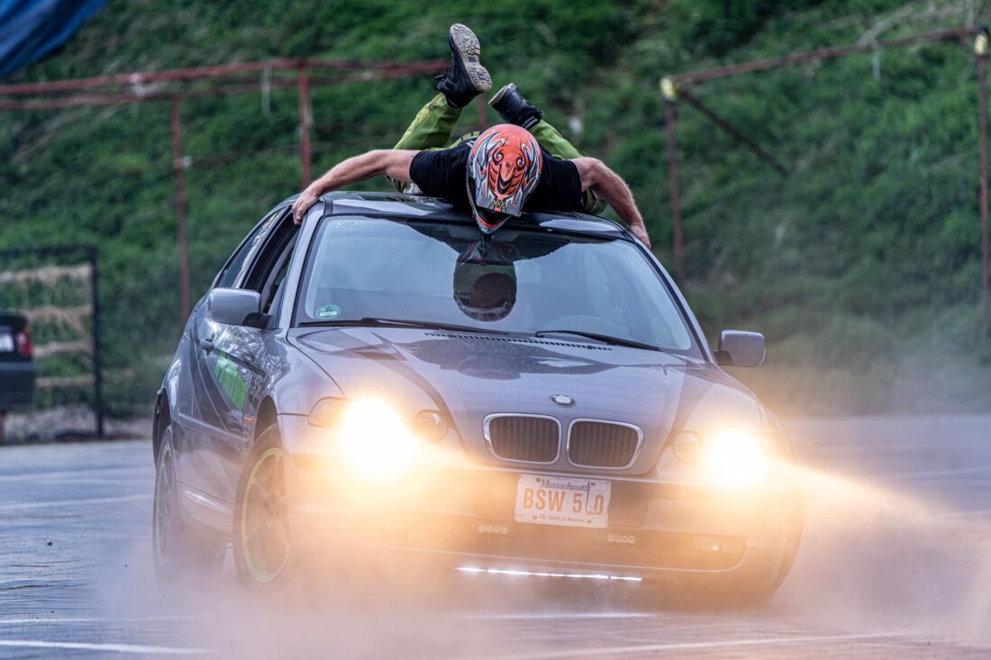 Przejazdy przez ścianę ognia z człowiekiem na masce ,