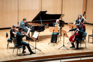 + foto (6): Artyści w trakcie wykonania II Koncertu fortepianowego f-moll op. 21 Fryderyka Chopina w wersji na fortepian i kwintet smyczkowy