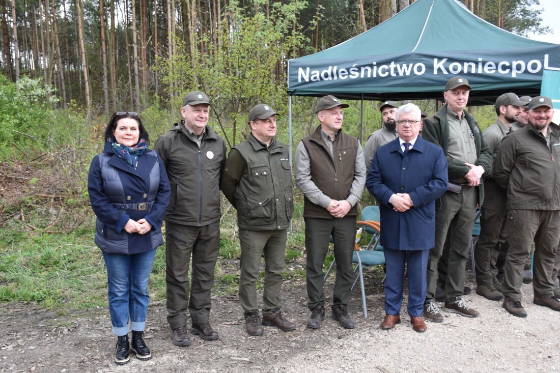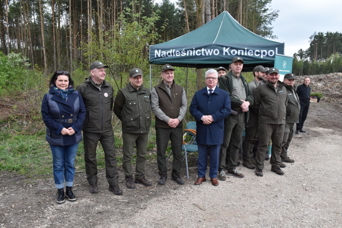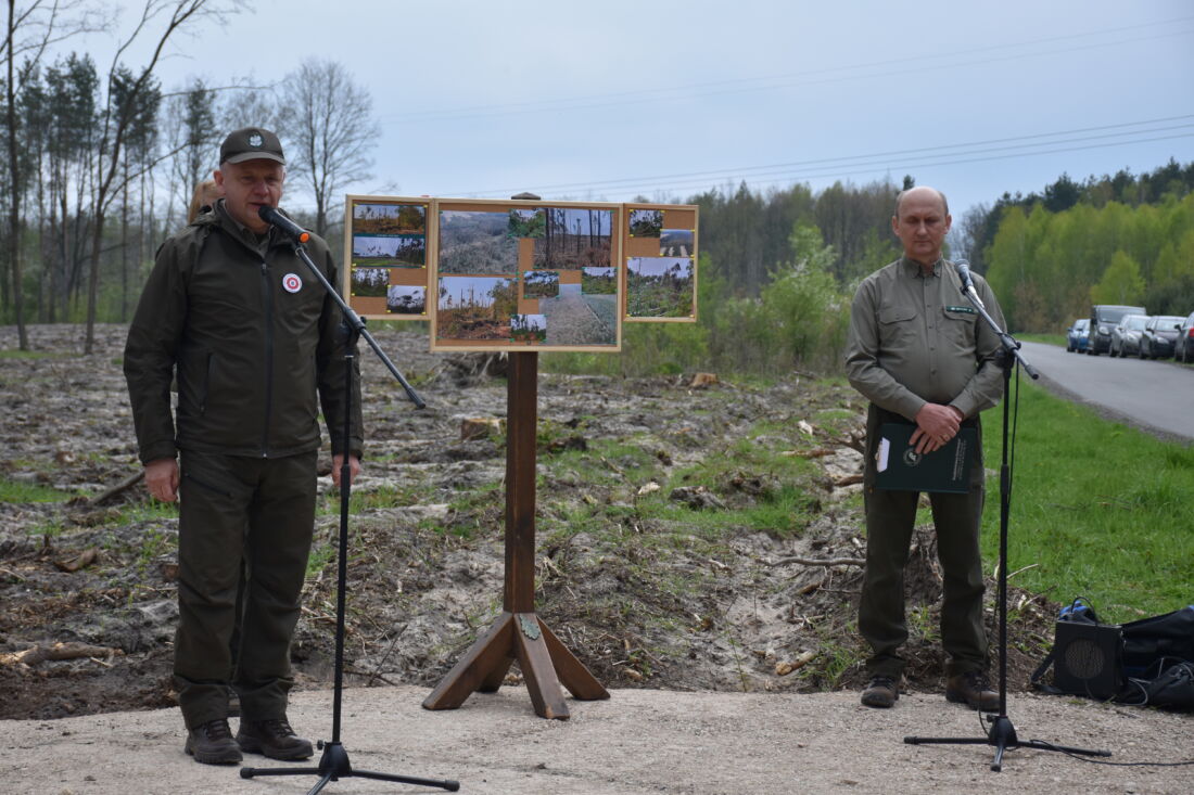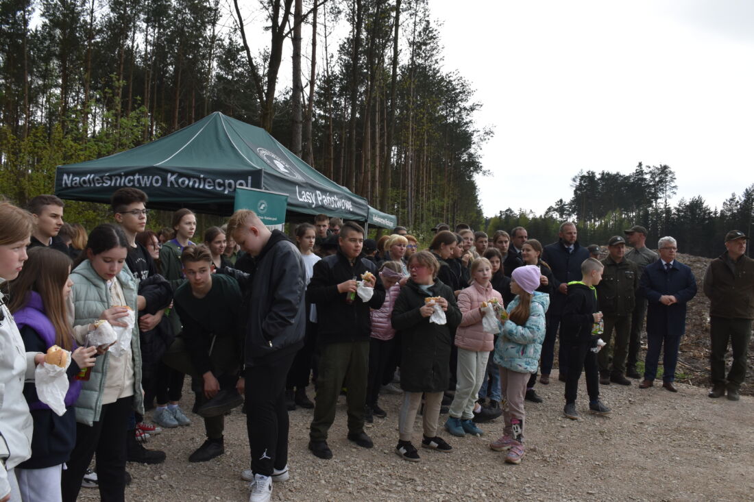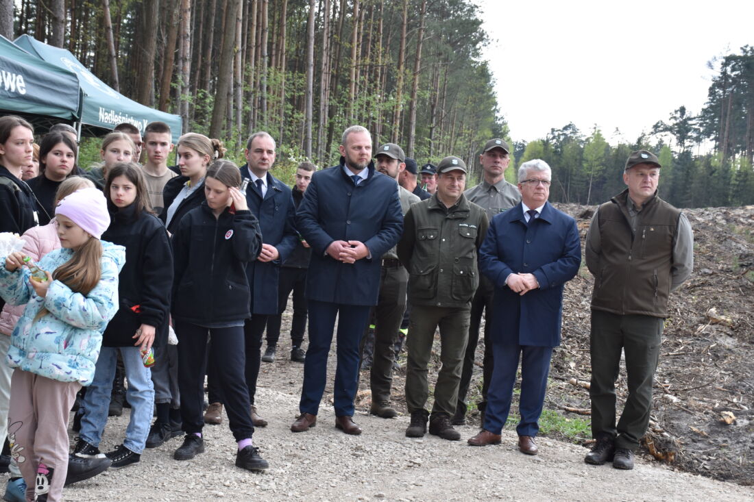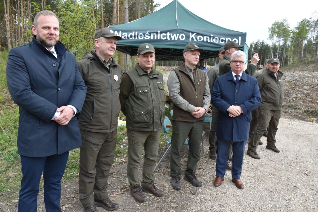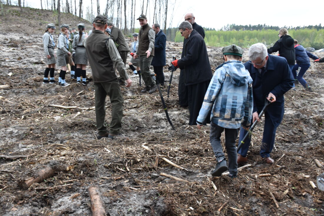 – Naszą misją jest codzienne dbanie o stan lasów – drzewostanu i zwierzyny. Zniszczony teren odnawialiśmy przez prawie dwa lata i dzisiaj Państwa pomoc pomoże przywrócić las środowisku. Wydarzenie łączymy z uczczeniem pamięci wielkiego Polaka św. Jana Pawła II, który kochał przyrodę i odnosił się do niej z niezwykłą wrażliwością. Umiłowanie przyrody wyniósł z domu rodzinnego, dlatego tak ważne jest wychowanie w duchu miłości i szacunku do natury – powiedział gospodarz, nadleśniczy Nadleśnictwa Koniecpol Przemysław Grabowski. Jednocześnie, w sposób szczególny, podziękował leśniczemu Robertowi Ciesielskiemu i podleśniczemu Marcinowi Barczykowi, którzy najbardziej przyczynili się do uporządkowania powierzchni pod sadzenie drzew.