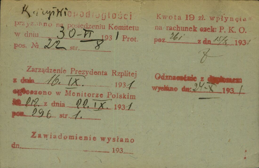 - Wyciąg z kartoteki CAW, dotyczący przyznania Krzyża Niepodległości w 1931 roku, wraz z odznaczeniem wystawiono czek na 19 złotych. W owym czasie za tę kwotę można było kupić elegancką koszulę szytą na miarę; kilogram sandacza kosztował 3 złote, kapelusz ok. 10 złotych, garnitur od 29 zł, miesięczna prenumerata „Kuriera Warszawskiego” 6 zł., 1 jajko 14–15 groszy