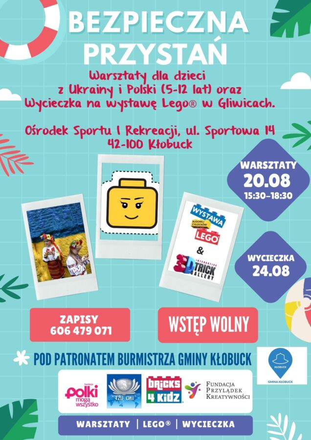 W sobotę 20 lipca oraz w środę 24 lipca Centrum Usług Społecznych w Kłobucku organizuje wydarzenie pod nazwą “Bezpieczna przystań”. Obejmuje on warsztaty dla dzieci z Ukrainy i Polski w Kłobucku oraz wycieczkę na wystawę LEGO w Gliwicach.