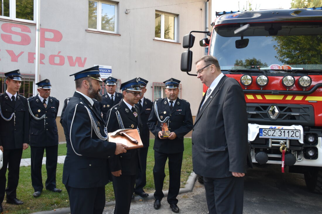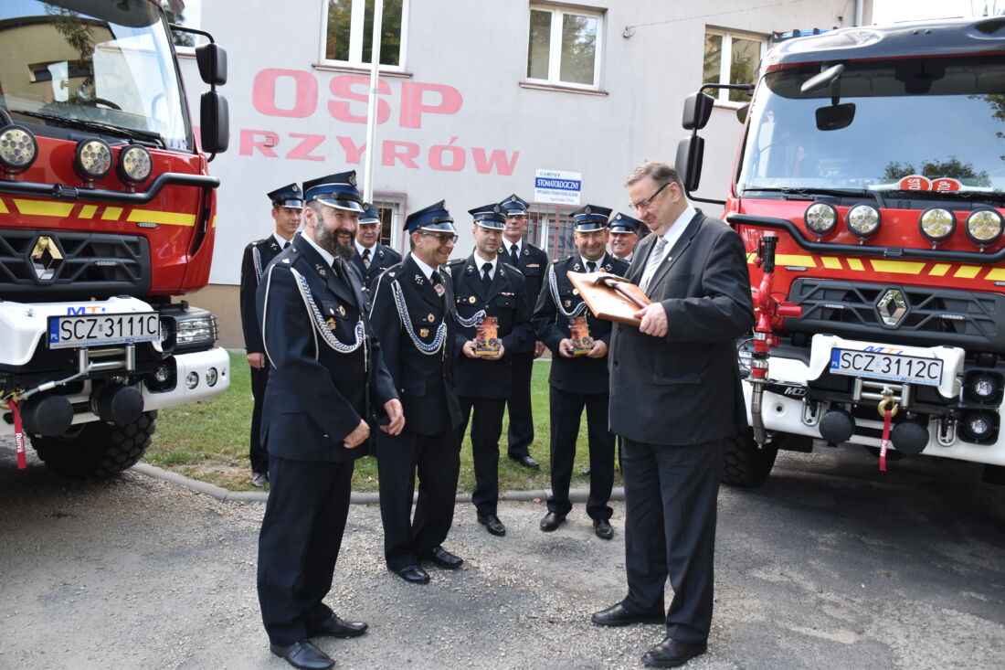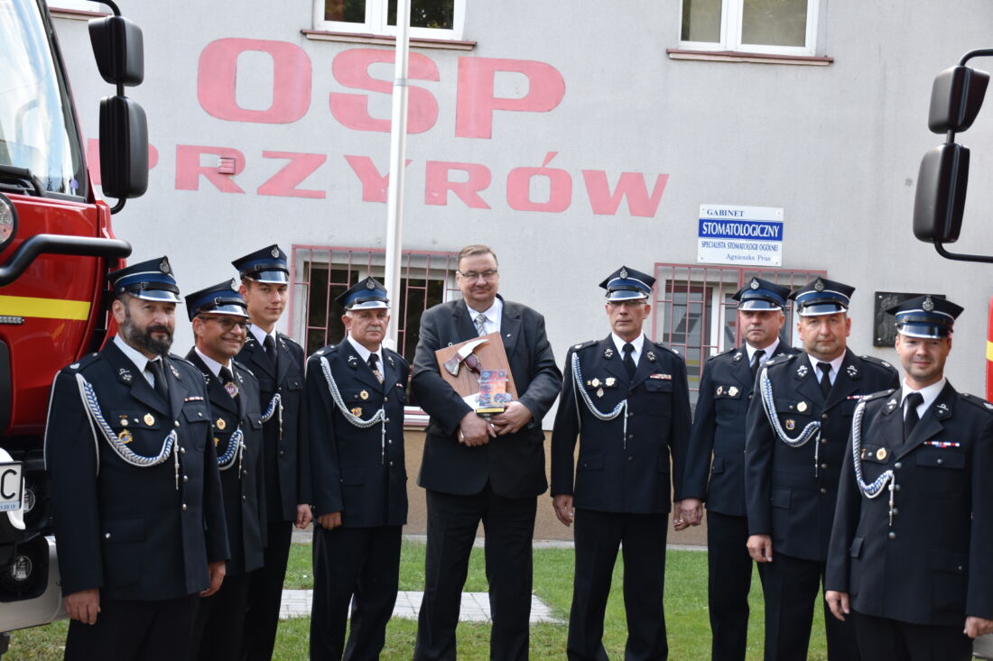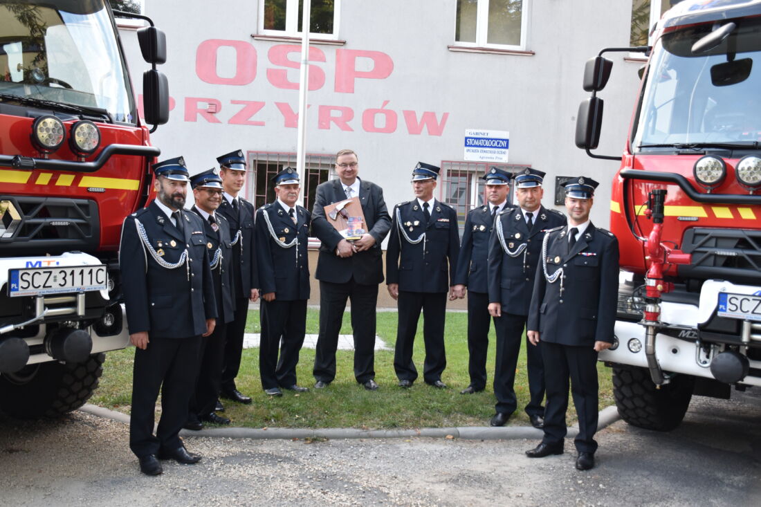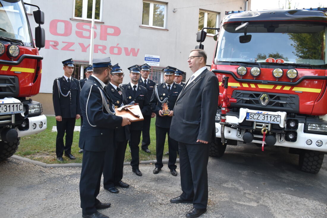 Druhowie z OSP Przyrów i OSP Staropole ofiarowali Wiceministrowi Szymonowi Giżyńskiemu symboliczny strażacki toporek – kowalskiej, ręcznej roboty. Przekazali także specjalne podziękowanie, za wsparcie przy pozyskaniu samochodu dla jednostki z Przyrowa.