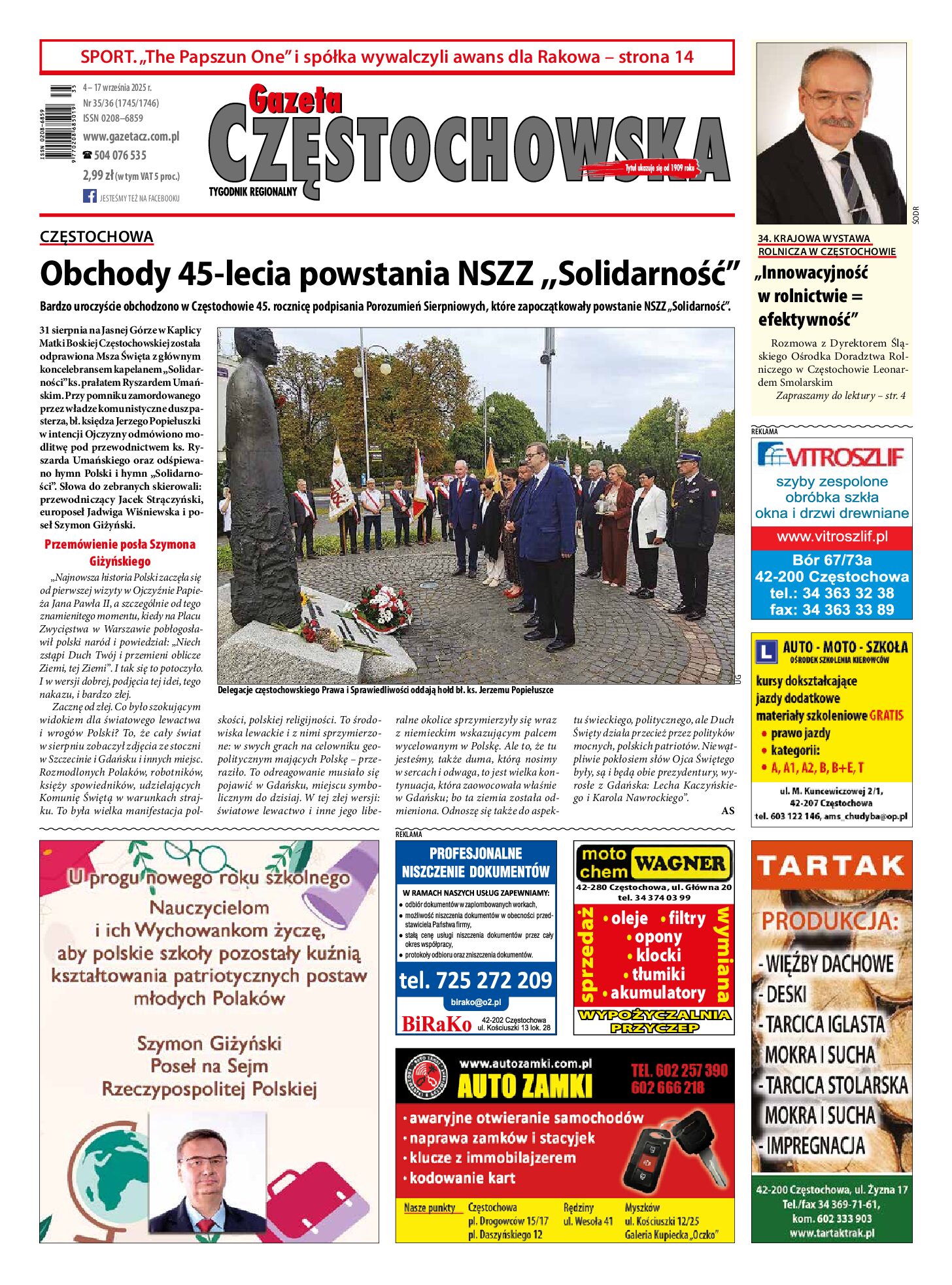 Zapraszamy do lektury najnowszego numeru. ,,Gazeta Częstochowska” jest już w punktach sprzedaży 1745 / nr 35 / 2025-09-04 | Gazeta Częstochowska | Wersja do wydruku | Data publikacji: 5 września 2025 Podziel się:
